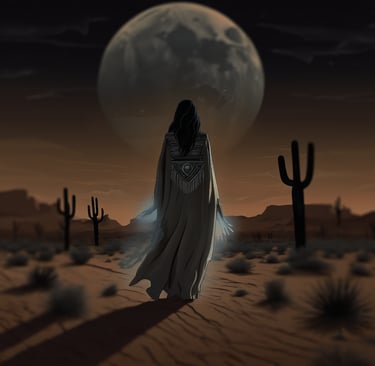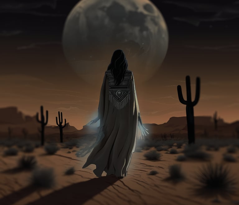 Just as she had moved in life, so did her spirit canter with a like grace in death. Through lingering cemetery mists she glissaded, waist-length obsidian locks – adorned with vibrantly colored beaded and feathered braids - and the shimmering gossamer of her traditional buckskin gown’s train flowing in lambent fluidity. Her long fingers brushed over weathered headstones and decaying wooden crosses; an unspoken acknowledgement, comforting of those weary souls whose epitaphs no longer bore their names. Beneath the saddened arms of a saguaro rent with fissures, the sagacious Signum Panthea of one of the many saints interwoven into Yaqui and Mexicano culture he did not recognize, wept - falling, they were tears; having fallen, blood - as she passed by.