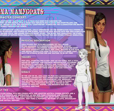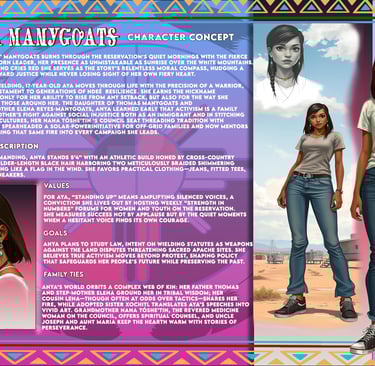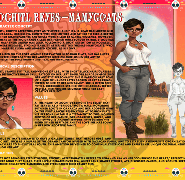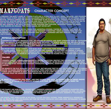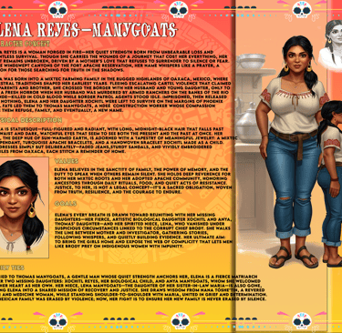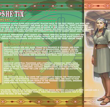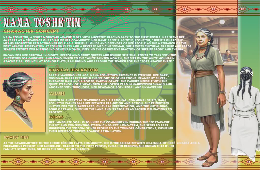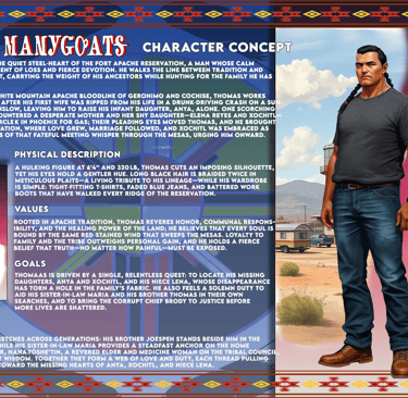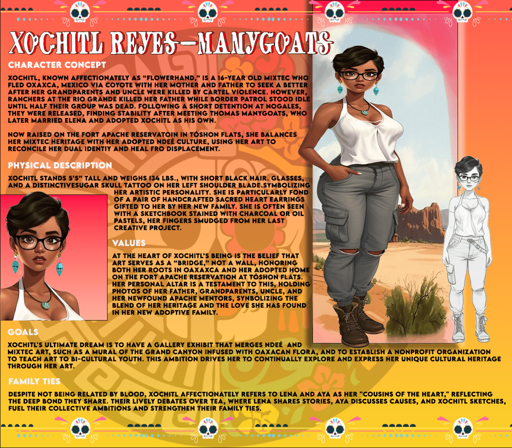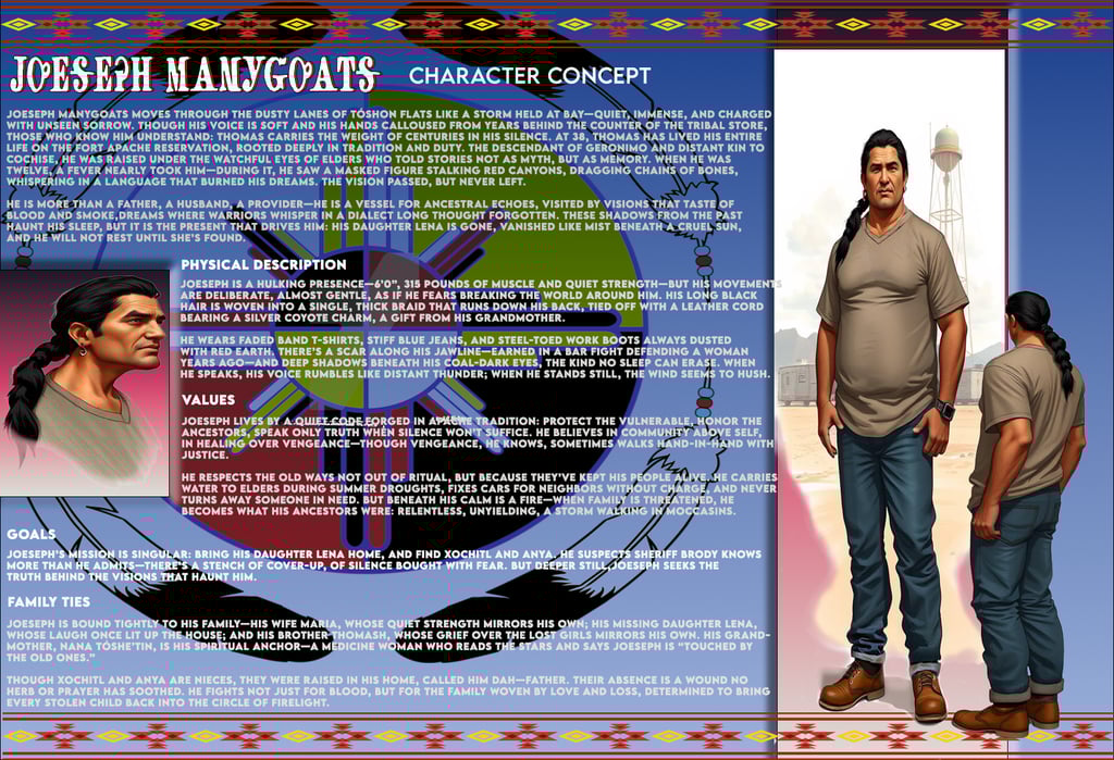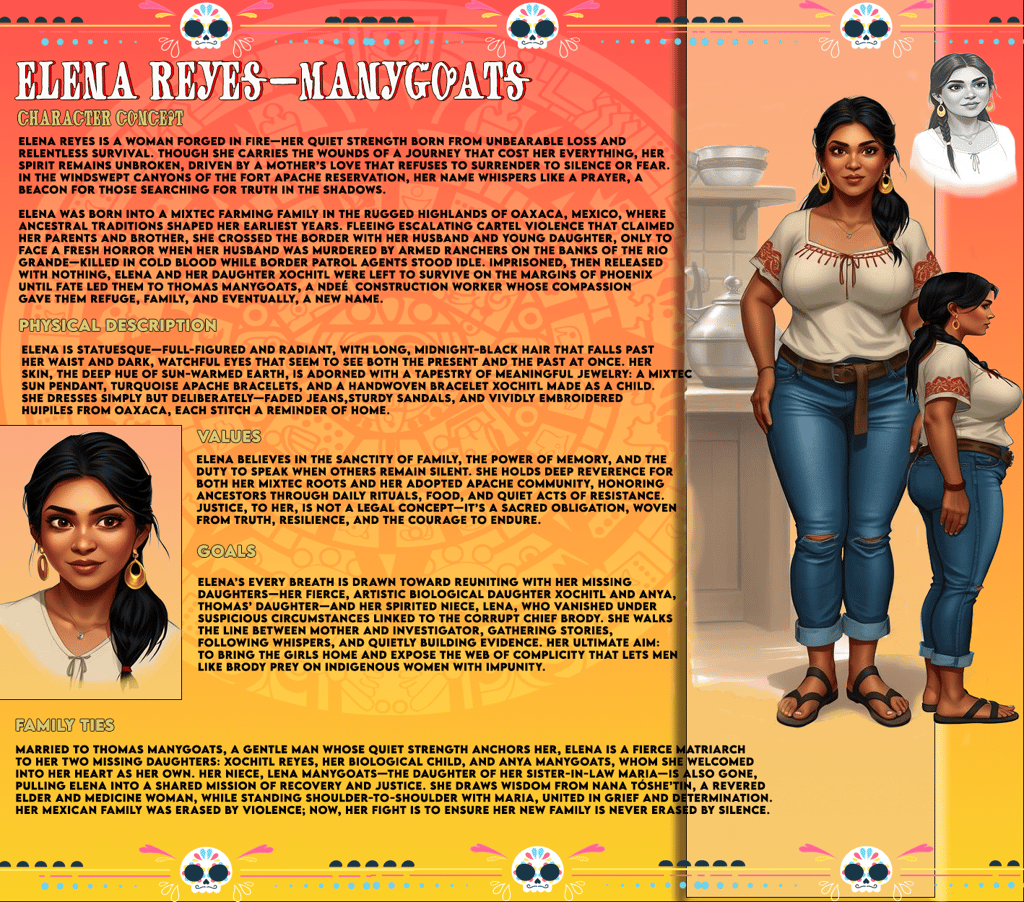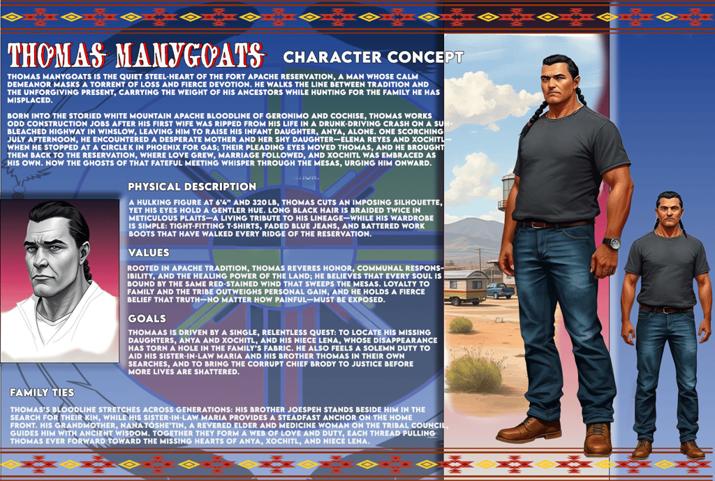 2) Thomas Manygoats (35) & Elena Reyes-Manygoats (34) – Xochitl’s Nde stepdad and biological Mixtec mother; bridge the Apache and Mexican lineages and safeguard family lore.