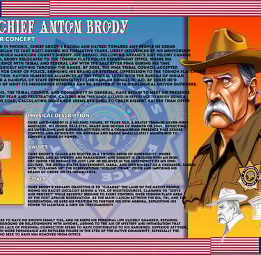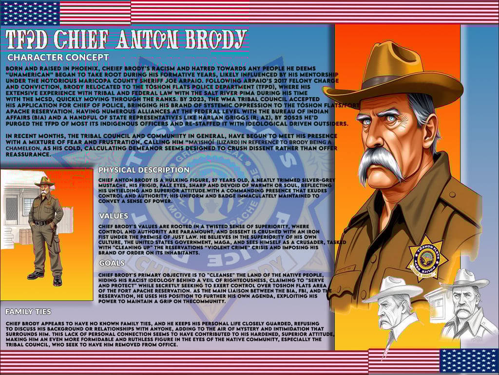 1) Chief Anton Brody (52) – Outsider appointed as head of Tribal police who purged the WMAPD of most of its Apache officers and re-staffed with ideologically driven outsiders; believes in the superiority of his own culture, sees himself as a crusader tasked with “Cleaning up the Reservation.”