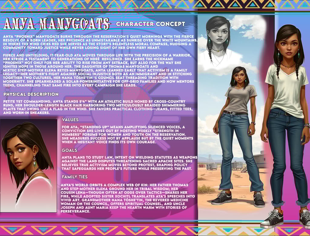 2) Anya “Phoenix” Manygoats (17) – Lena’s cousin, fierce and reborn in spirit; her dedication to social justice a rallying point for search parties; currently missing.