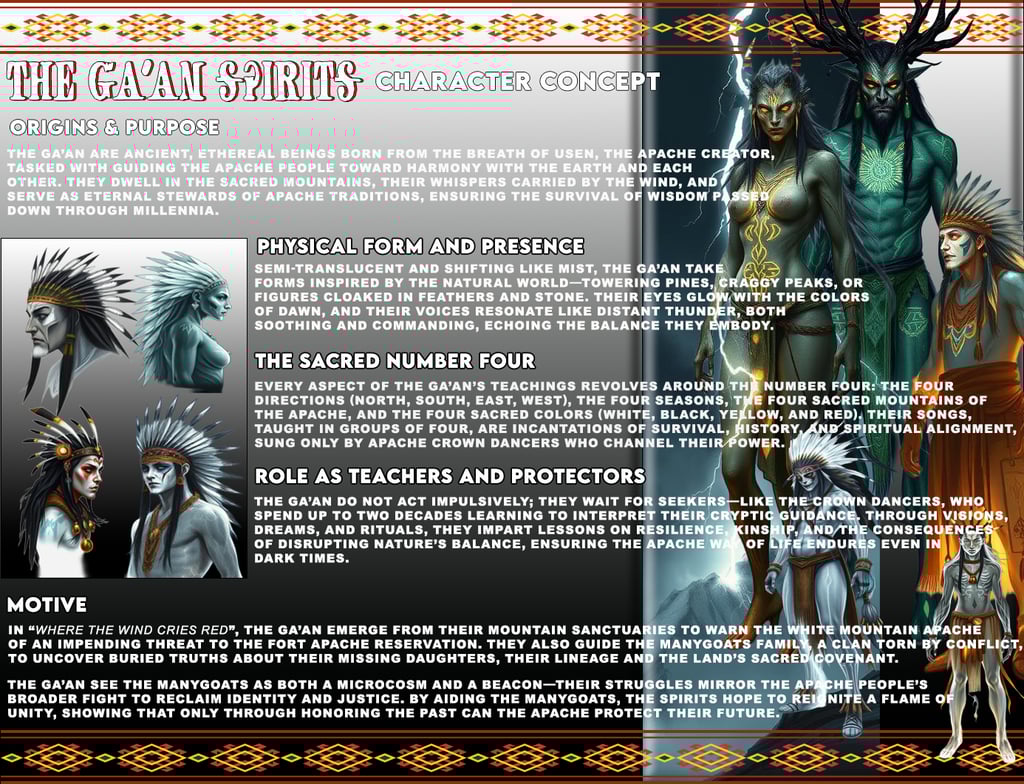 • The Wind Speaker (Associated with the Ga’an) – Mysterious figure appearing in dreams, stories, and Sammy Boy’s drawings. Not physically present but referenced in prayers and warnings; embodies the spirit of the land’s grieving memory.