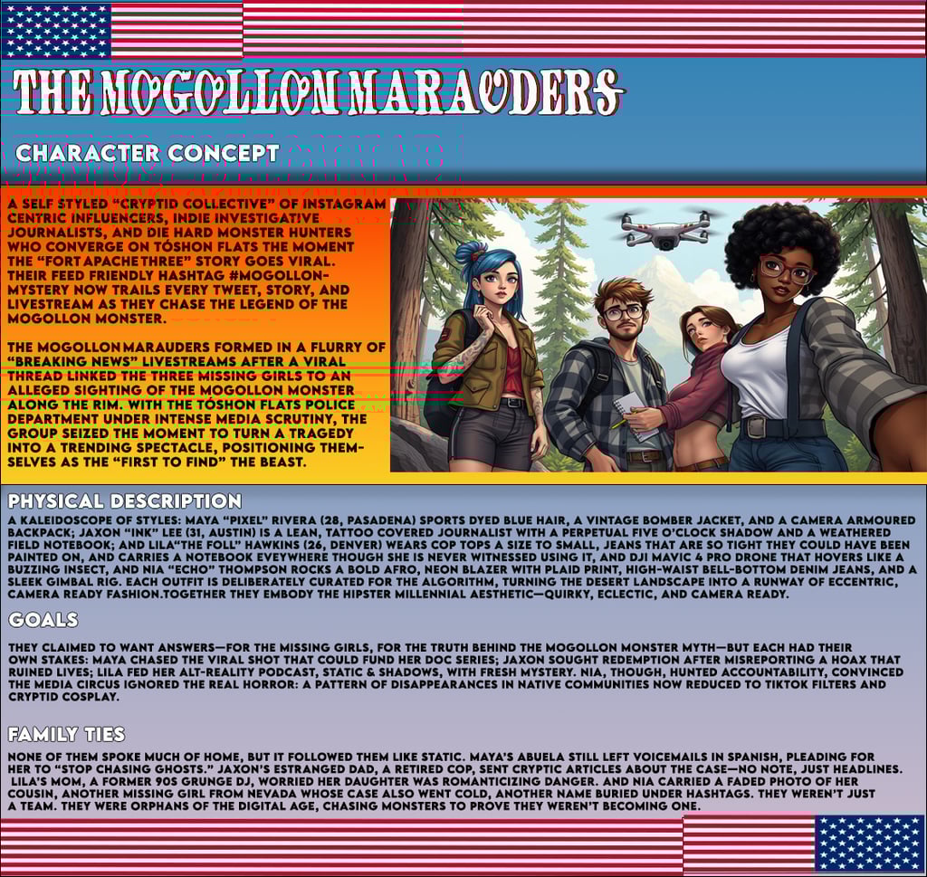 4) The Mogollon Marauders (Diverse late 20s-mid 30s group) – Trend-setting “monster hunter” influencers; their live streams turn the legend into a viral spectacle.