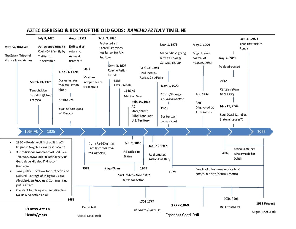 An example would be Rancho Aztlan, the decadent, cursed, coffee-and-cults-riddled heart of my “Aztec Espresso & BDSM of the Old Gods” novellas. The 1952 drought that killed 300 sheep? It didn’t make it to the story. The 1987 “incident” at the old mission where three people reported hearing drums under the earth? Yeah, that one is in. Also not fully explained. Mystery is a feature, not a bug.